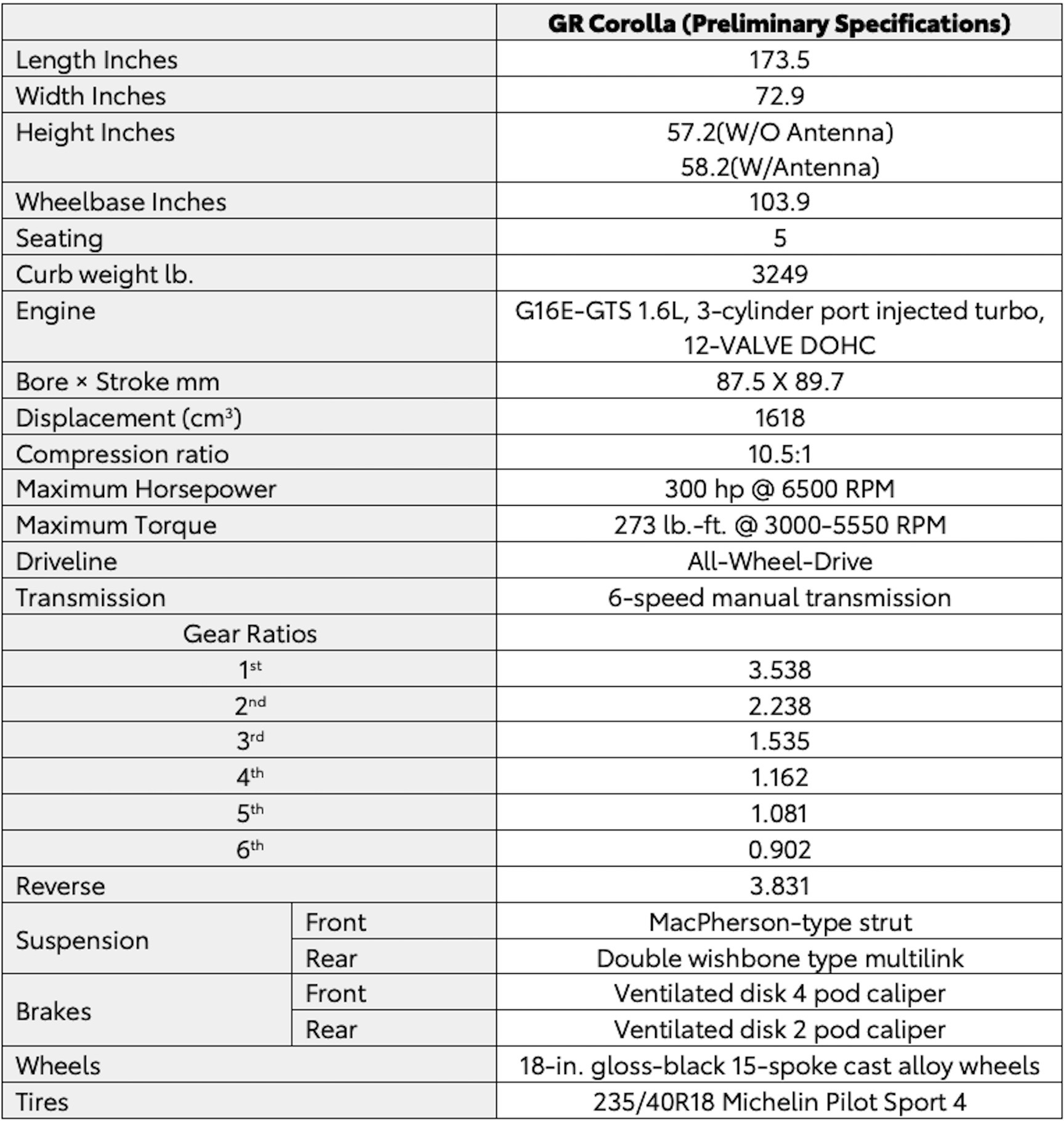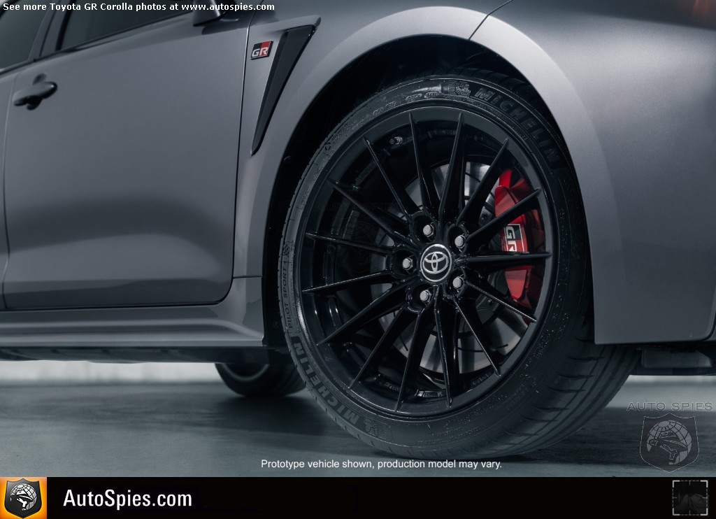 Wide tread tires ensure high cornering performance while maintaining the excellent high speed stability of the GR Corolla’s 103.9-inch long wheelbase. It wears Michelin Pilot Sport 4 tires 235/40R18 on the both grades and comes equipped with 18-in. gloss-black 15-spoke cast alloy wheels on the grades.