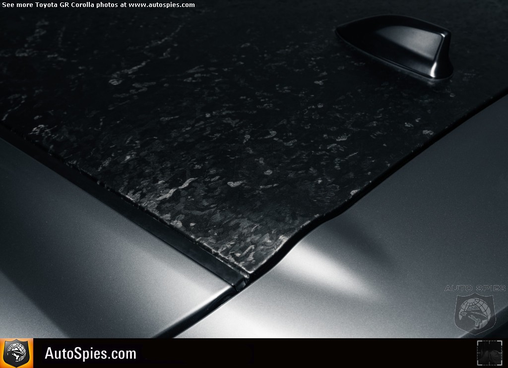 Both grades feature wide front and rear fender-flares. The Circuit Edition features a bulge hood with functional gloss-black air ducts. The Carbon Fiber roof on the Circuit Edition is matched with a matte-black roof mounted shark fin antenna. The Core Grade features an aluminum hood with a color-keyed roof and matching shark-fin antenna. Gloss-black heated power outside mirrors with turn signal indicators, gloss-black window molding and black GR Corolla badges are standard on both grades.